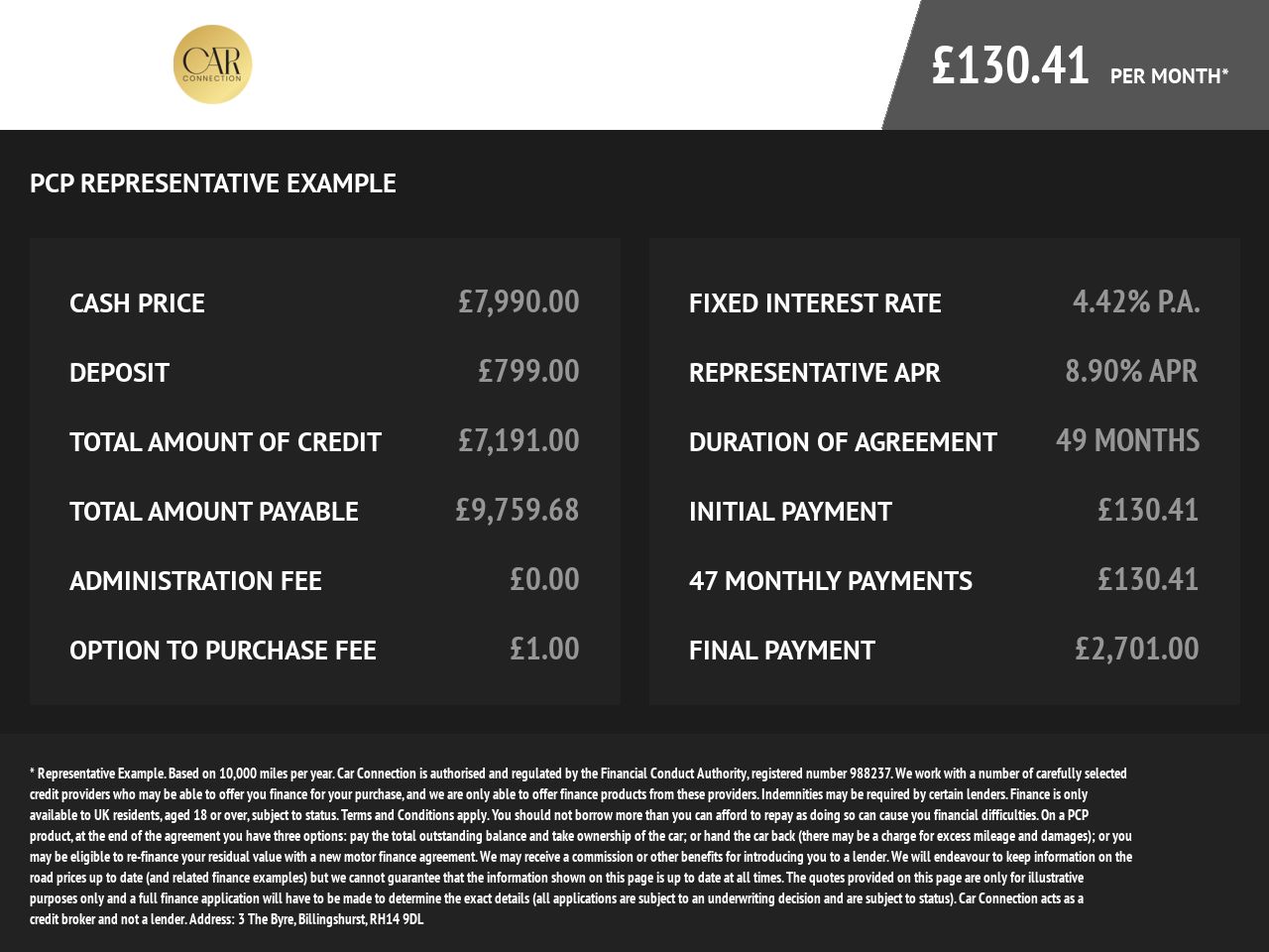 Finance available subject to status. Indemnities may be required. Other finance offers may be available but cannot be used in conjunction with this offer. We work with a number of carefully selected credit providers who may be able to offer you finance for your purchase. We are only able to offer finance products from these providers. Postal Address: 3 The Byre, , Billingshurst, West Sussex, RH14 9DL
